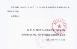 本項目截止2021年2月18日17時00分前,繳納投標保證金家數(shù)未滿三家,故作流標處理。特此通知!采購人:雅安市名山區(qū)茶城建設(shè)工程有限公司采購招標代理機構(gòu):四川省中遂建設(shè)項目管理有限公司日期:2021年2月20日...