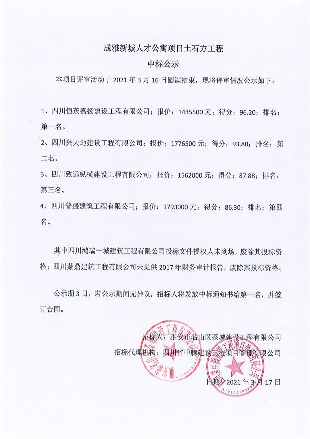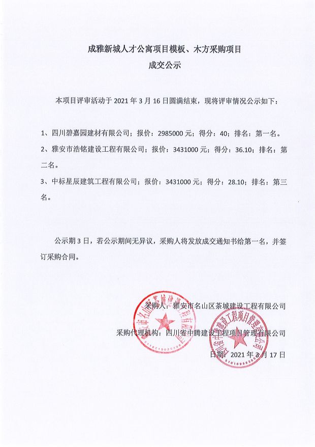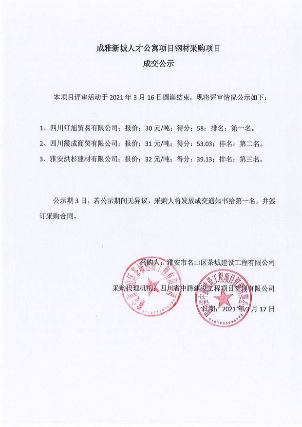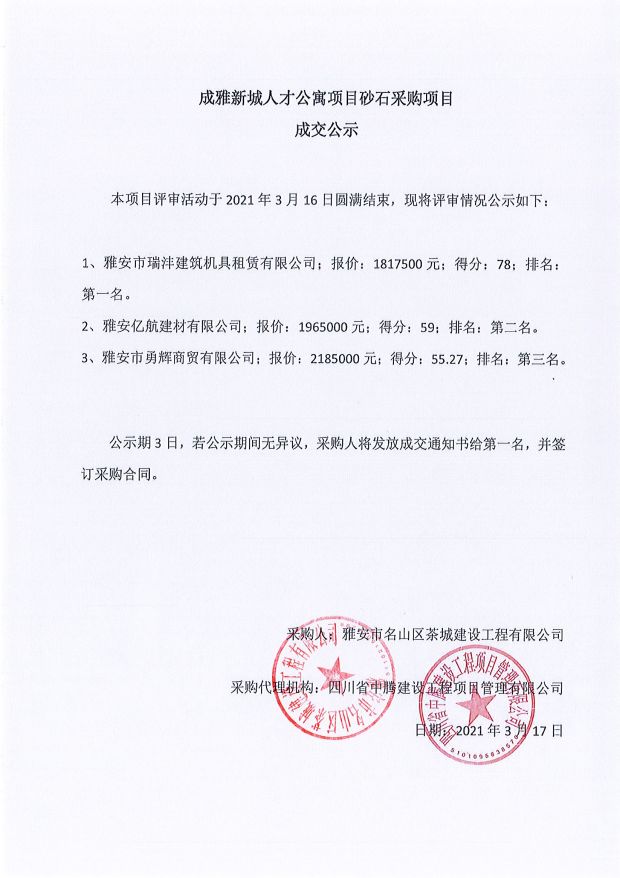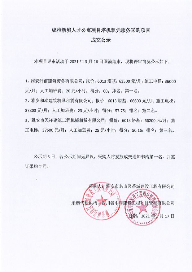 成雅新城人才公寓砂石、塔機租賃、土石方、鋼材、管架租賃、模板木方、水泥采購項目成交公示