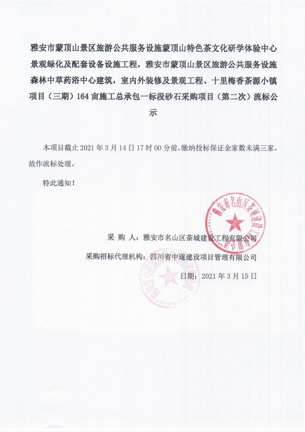 雅安市蒙頂山景區(qū)旅游公共服務(wù)設(shè)施蒙頂山特色茶文化研學(xué)體驗(yàn)中心景觀綠化及配套設(shè)備設(shè)施工程,雅安市蒙頂山景區(qū)旅游公共服務(wù)設(shè)施森林中草藥浴中心建筑,室內(nèi)外裝修及景觀工程、十里梅香茶源小鎮(zhèn)項(xiàng)目(三期)164畝施工總承包一標(biāo)段砂石采購(gòu)項(xiàng)目(第二次)流標(biāo)公示