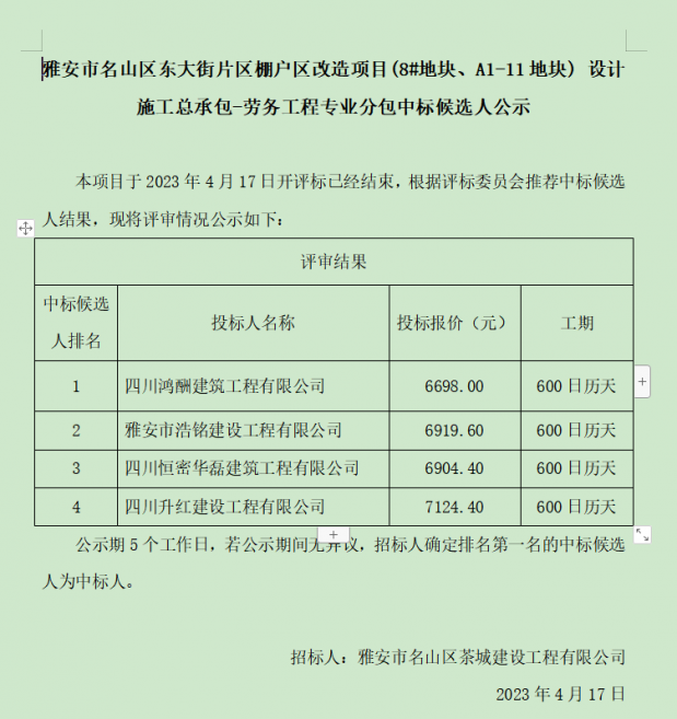 雅安市名山區(qū)東大街片區(qū)棚戶(hù)區(qū)改造項(xiàng)目(8#地塊、A1-11地塊) 設(shè)計(jì)施工總承包-勞務(wù)工程專(zhuān)業(yè)分包中標(biāo)候選人公示