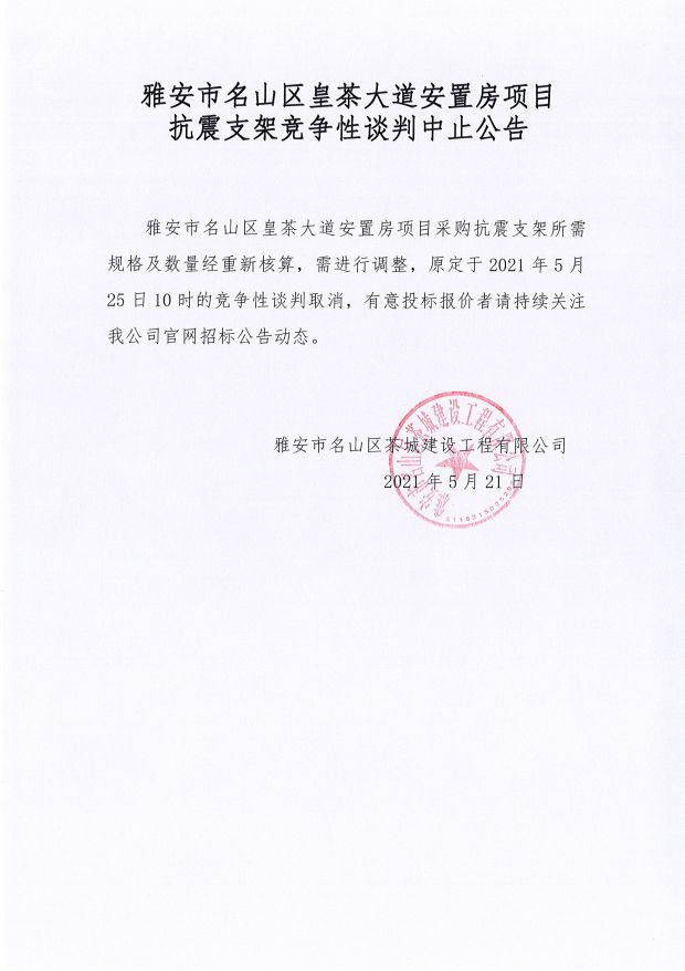 雅安市名山區(qū)皇茶大道安置房項(xiàng)目抗震支架競爭性談判中止公告